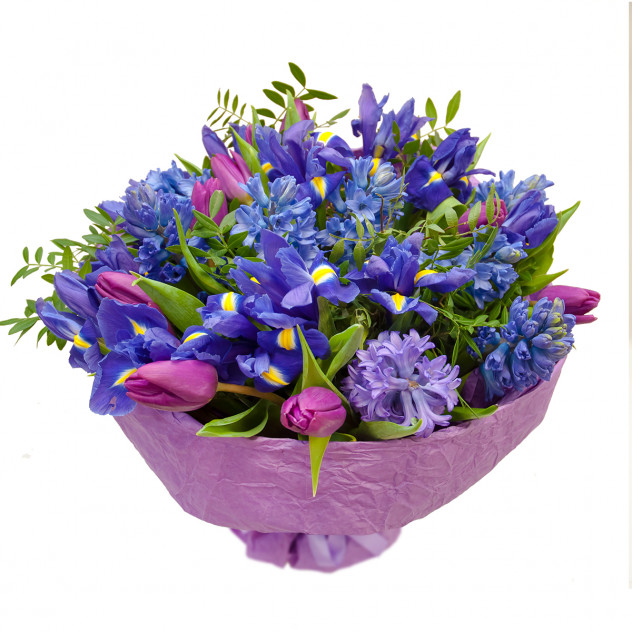 Состав: Упаковка для букета: крафт-бумага, Фисташка 4шт., Тюльпан 10шт., Ирис 10шт., Гиацинт 9шт.