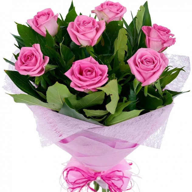 Состав: Роза розовая 60 см - 7шт., Упаковка для букета: фетр 2шт., Рускус 10шт.