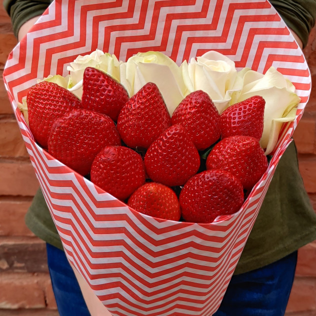 Естественно, что это букет из клубники с розами понравится любому адресату без исключения, ведь это симбиоз неповторимой красоты, аппетитного аромата и сладкого вкуса!!! Роза - 5 шт.