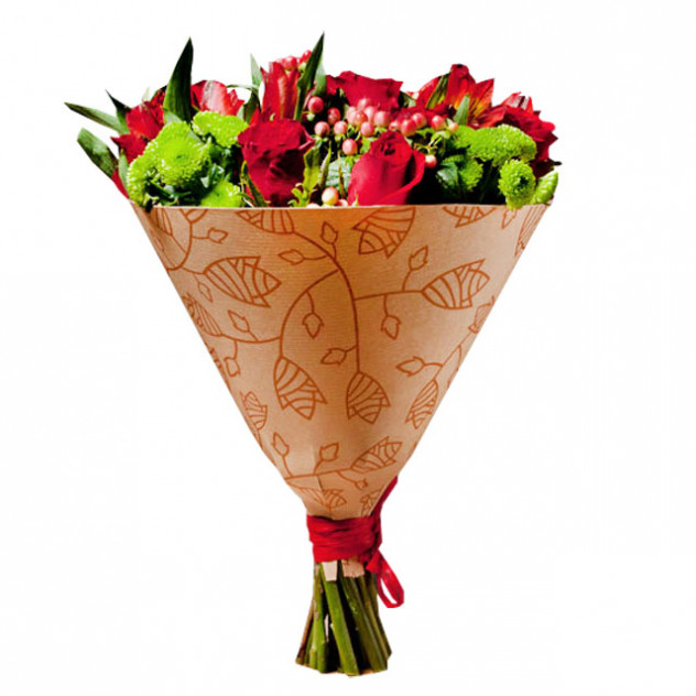 Состав: Упаковка для букета: крафт-бумага, Роза красная 60 см 7шт., Хризантема кустовая 3шт., Альстромерия 5шт., Гиперикум 5шт., Рускус 10шт.