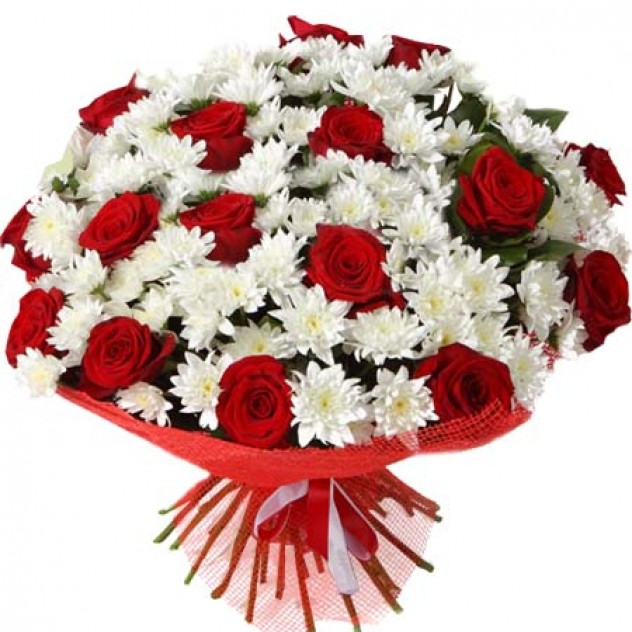 Состав: роза 25 шт, хризантема кустовая 20шт, декор.