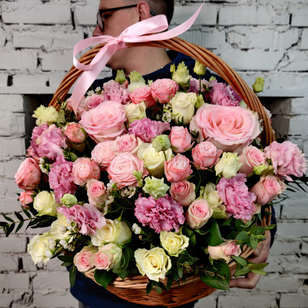 Корзина из ароматных роз в плетёной корзине.