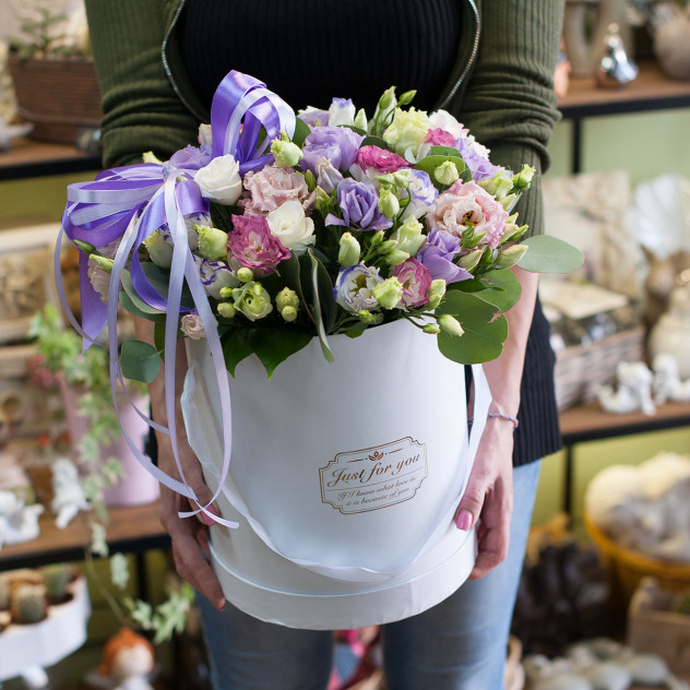 Стильная шляпная коробка из разноцветных лизиантусов 17 шт, эвкалпт 5 шт, шляпная коробка, бант.